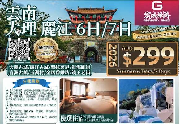 【超值精选】ZGM 2026 中国 云南大理丽江 6日/7日--大理古城/丽江古城/圣托里尼/洱海廊道/喜洲古镇/玉湖村/金马碧鸡坊/钱王老街